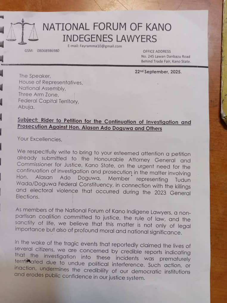 Kano Indigene Lawyers Demand Justice: Petition Senate and House Leadership Over Alleged 2023 Election Killings Involving Hon. Alhassan Doguwa